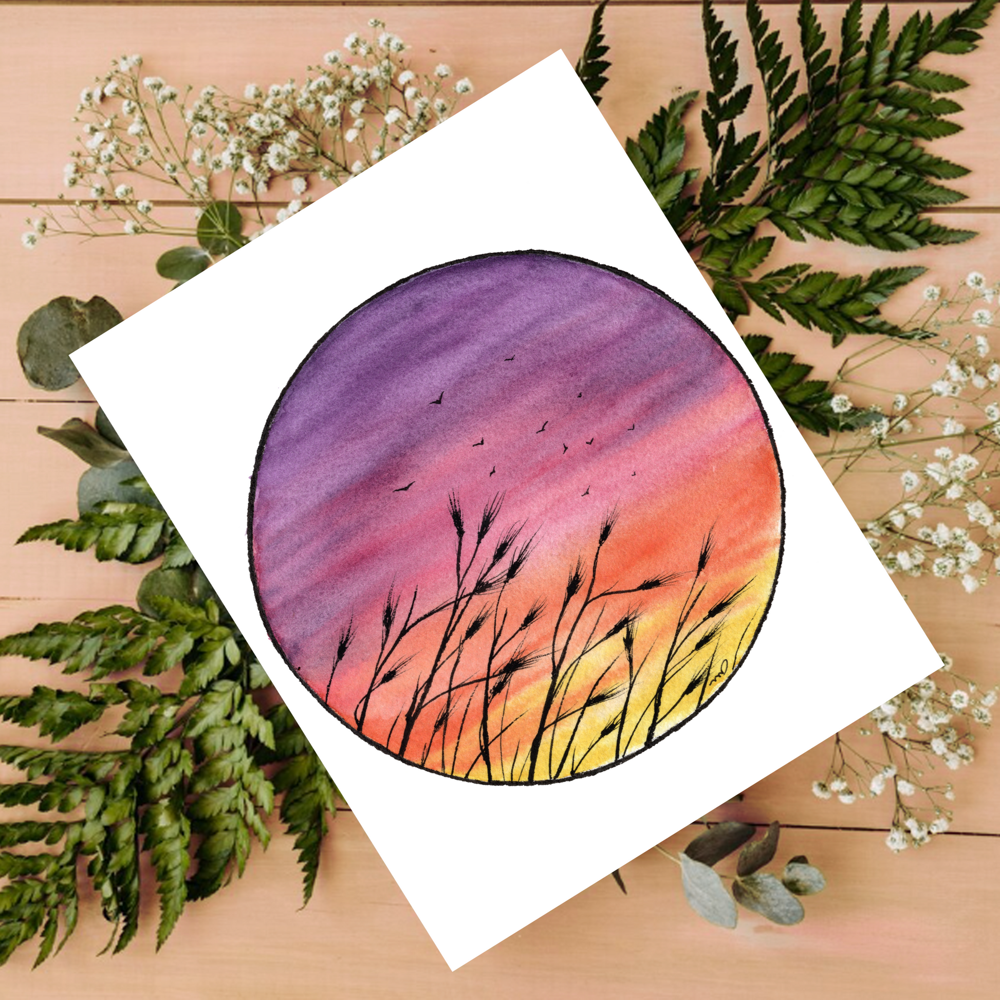 Walk through a sun-soaked field of amber waves and take a moment to appreciate nature's beauty with this gorgeous greeting card. Featuring wheat stalks, soaring birds and a stunning sunset, this 4.25"x5.5" card is perfect to send a special message to a special someone. Get them this unique card to show that you care!
