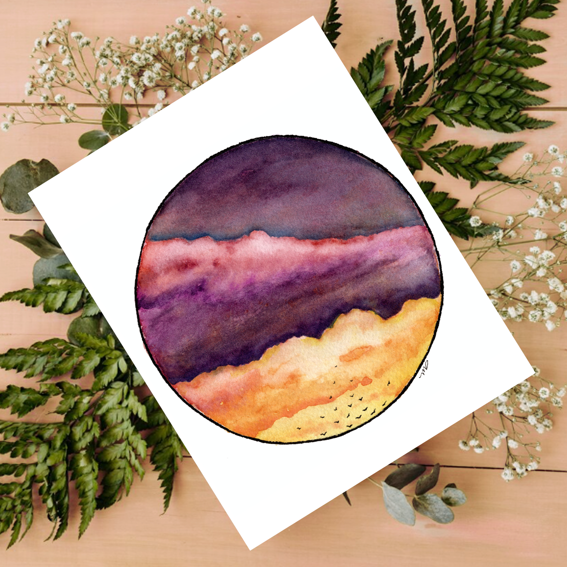 "Autumn Rolls In" with this fall-hued card featuring richly-colored rolling clouds, and birds flying in the sky. Just the thing to send some cheer and a smile to friends and family! A great 4.25x5.5" blank greeting card with envelope.
