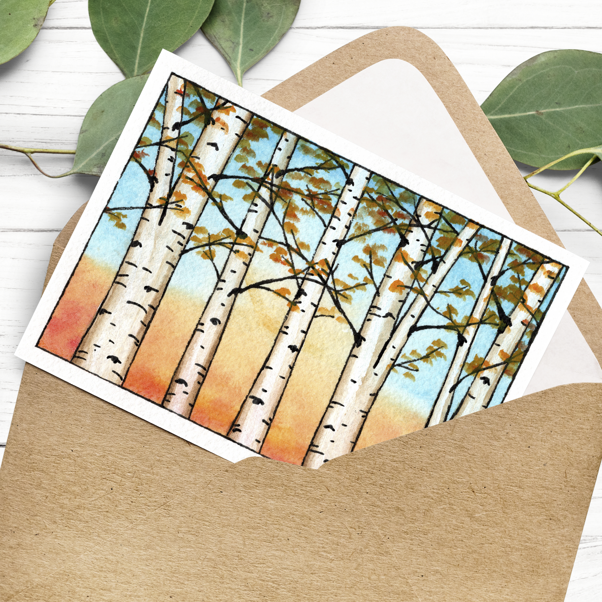 Let "Birch Blaze" light up your day! This 4.25x5.5" greeting card features a beautiful golden birch trees, their branches delicately silhouetted against a warm, peaceful forest backdrop with the sun shining through. Buy a card and send some special cheer!