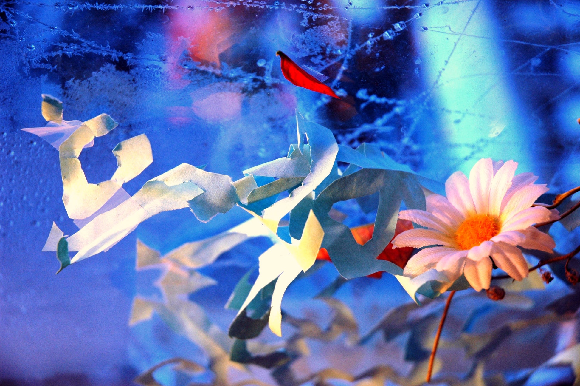 Structured snowflake cut out and daisy adhered to living room window. Frost on the window pane, lots of snow outside. Waiting for the blue light to appear as the orange rays sunset dip over the horizon.