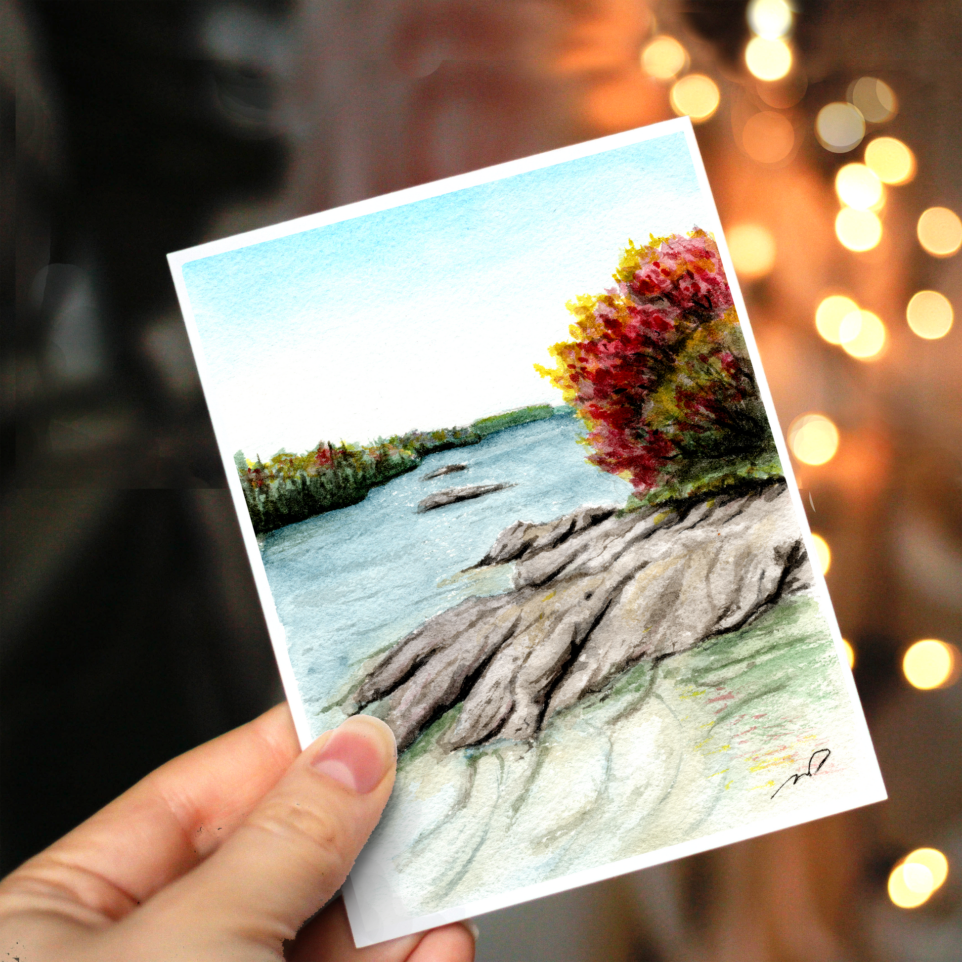 Experience serene luxury with "Burning on the Water". Revel in a tranquil Muskoka lake, sprinkled with sprawling rocks and fiery foliage, encapsulating the natural beauty of a sunny autumn day. With its refined design and sophisticated style, this card is perfect for any occasion.