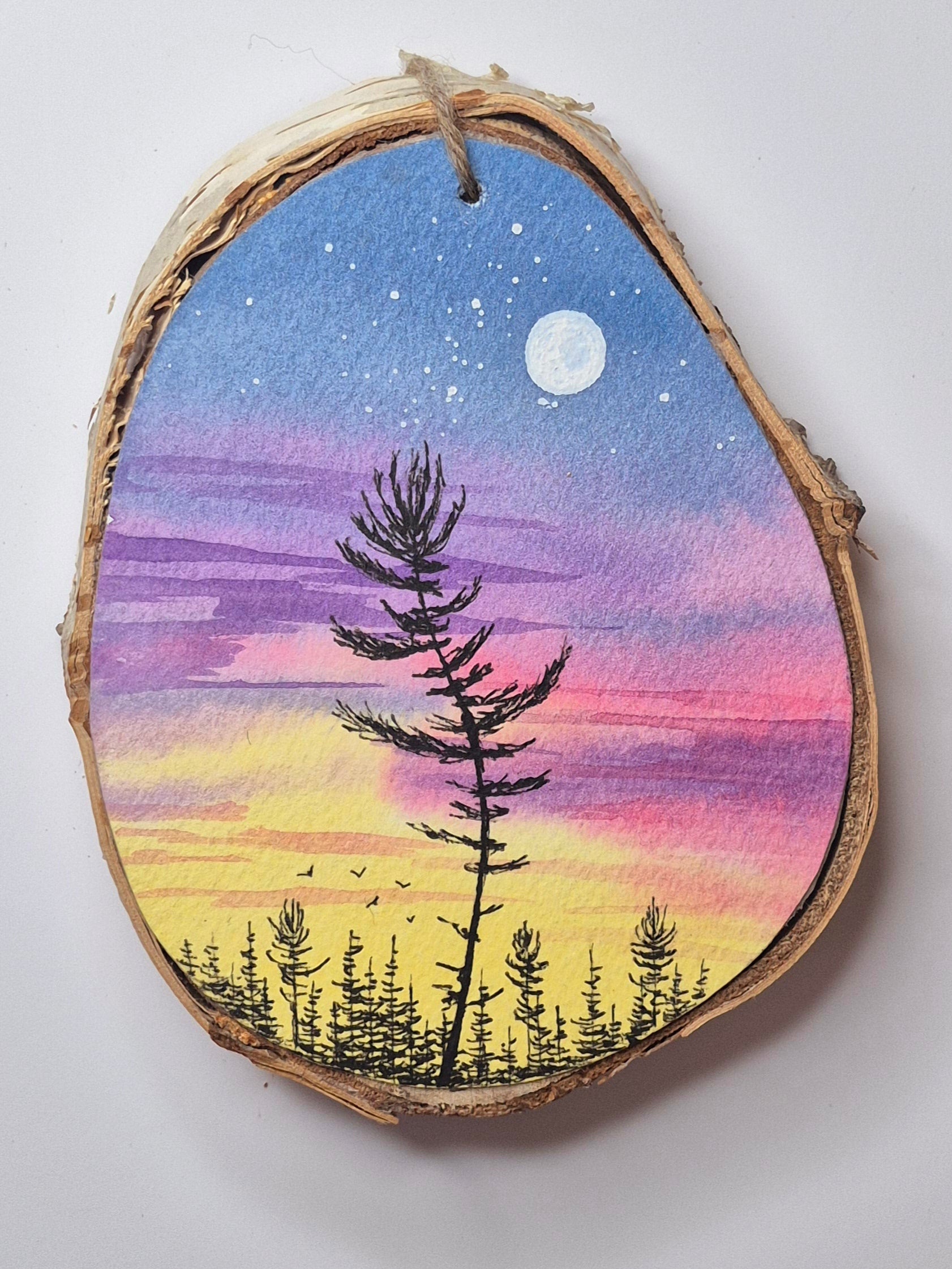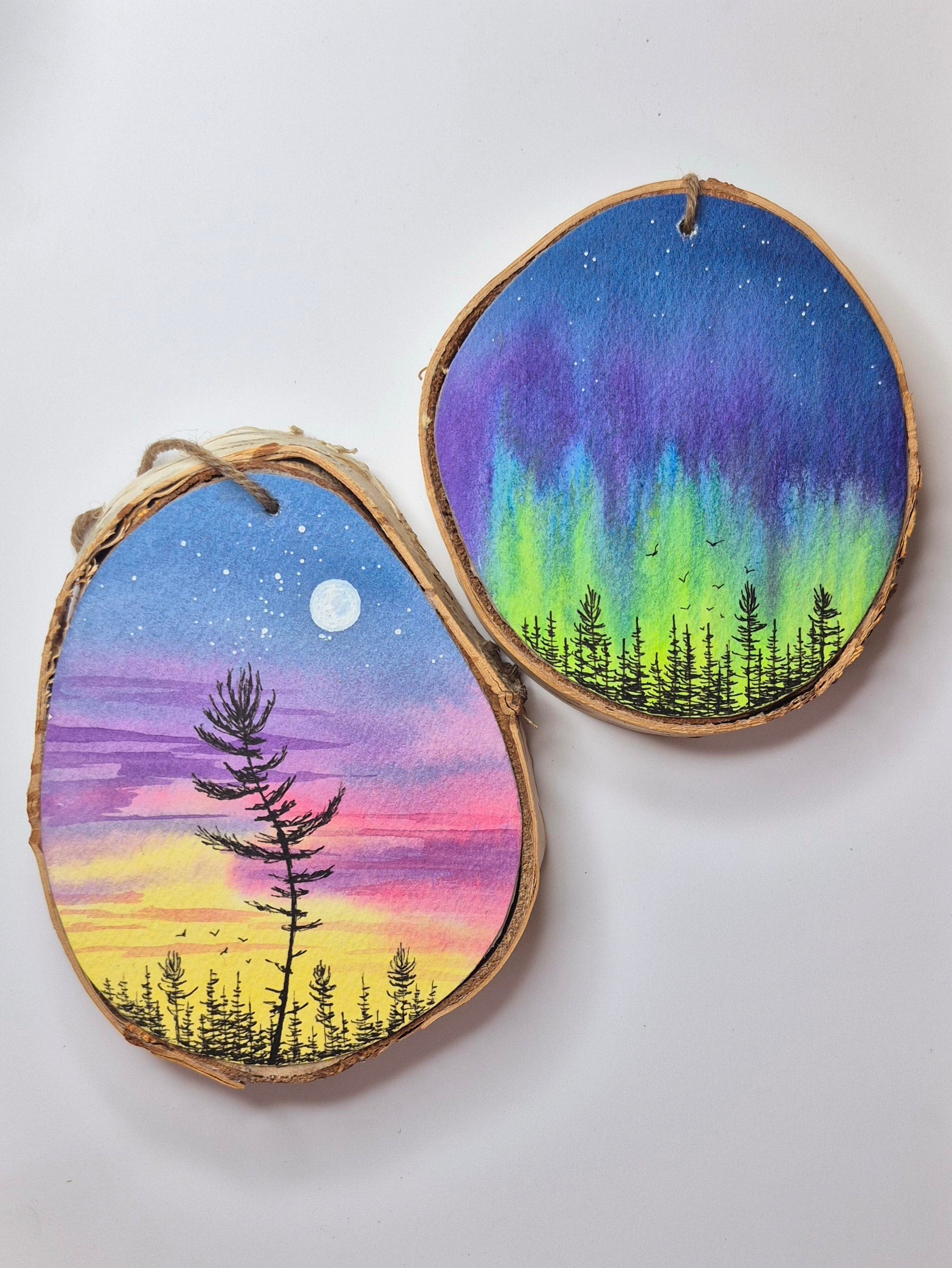 Brighten up your holiday décor with these charmingly hand-painted wood slice ornaments! Create your own unique story in the stars, with an enchanting watercolour sky, moon, sunset and winter designs, sure to light up any winter night. (Or even summer!) Enjoy a beautiful and one-of-a-kind addition to your holiday collection!