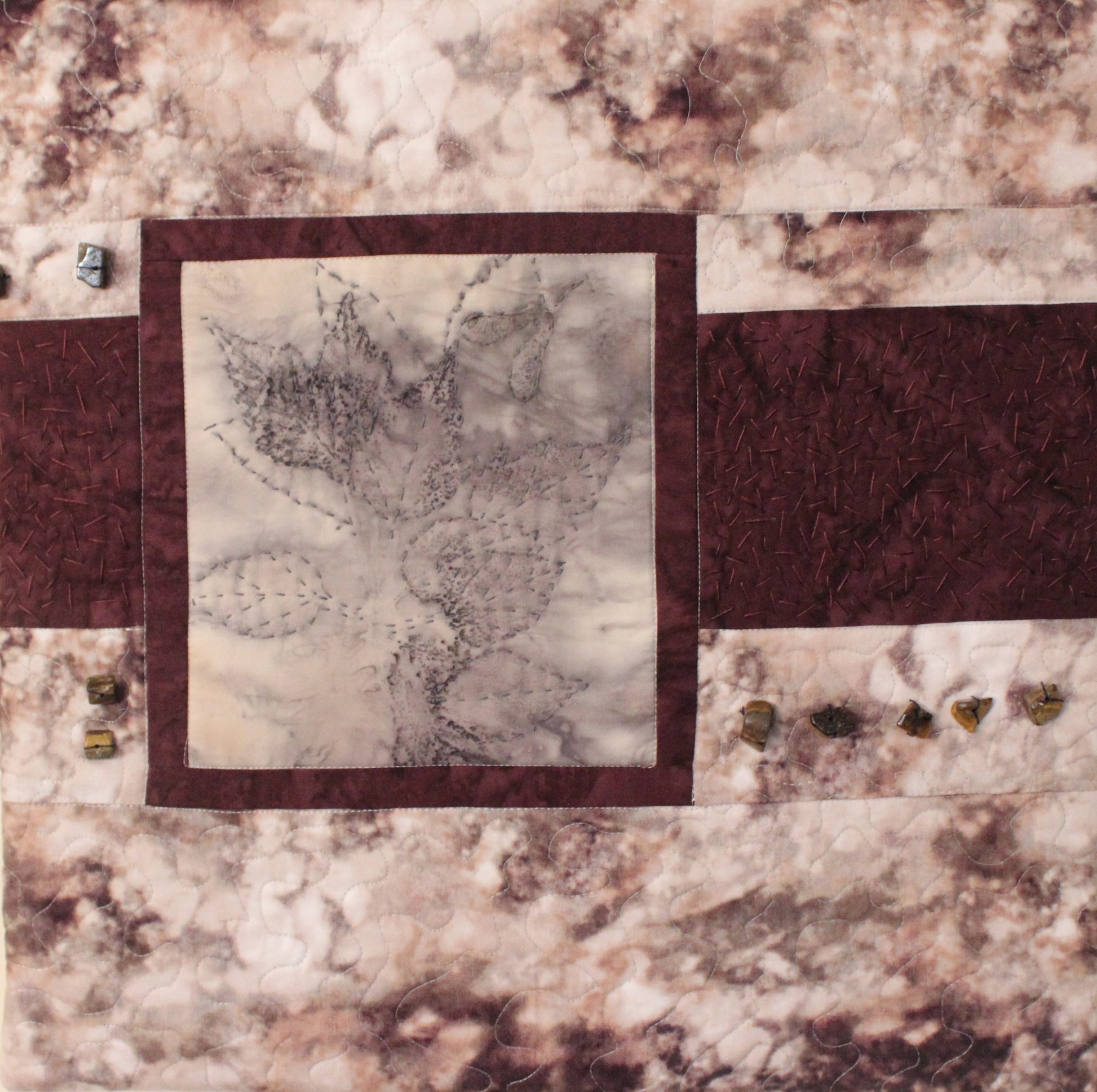 The maple keys and leaves were eco-dyed on silk fabric. Additional fabric was added to the layout. Then the design was machine quilted and embellished with embroidery floss and stones. It is mounted on a 14" square canvas.