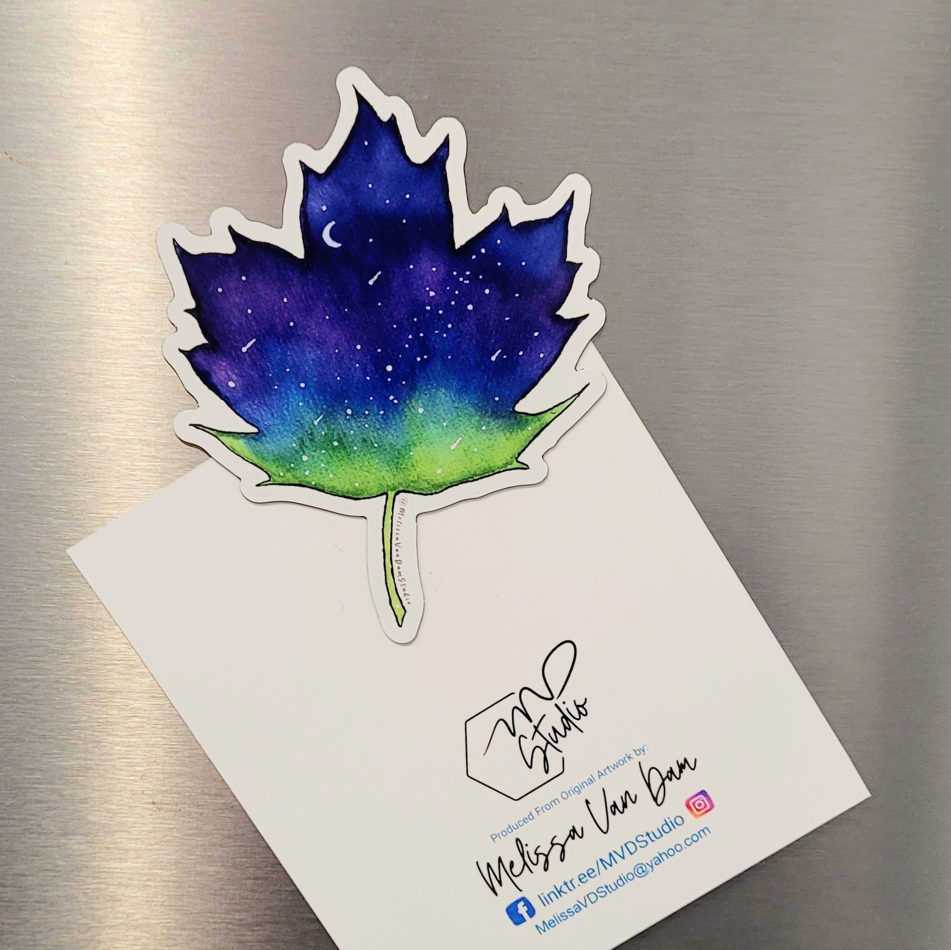 Tired of your same old fridge magnets? Spice up your kitchen with the "Maple Leaf" Magnet! This amazing sticker's vibrant watercolor design, featuring the North Lights, is a great way to add a splash of color to any space!