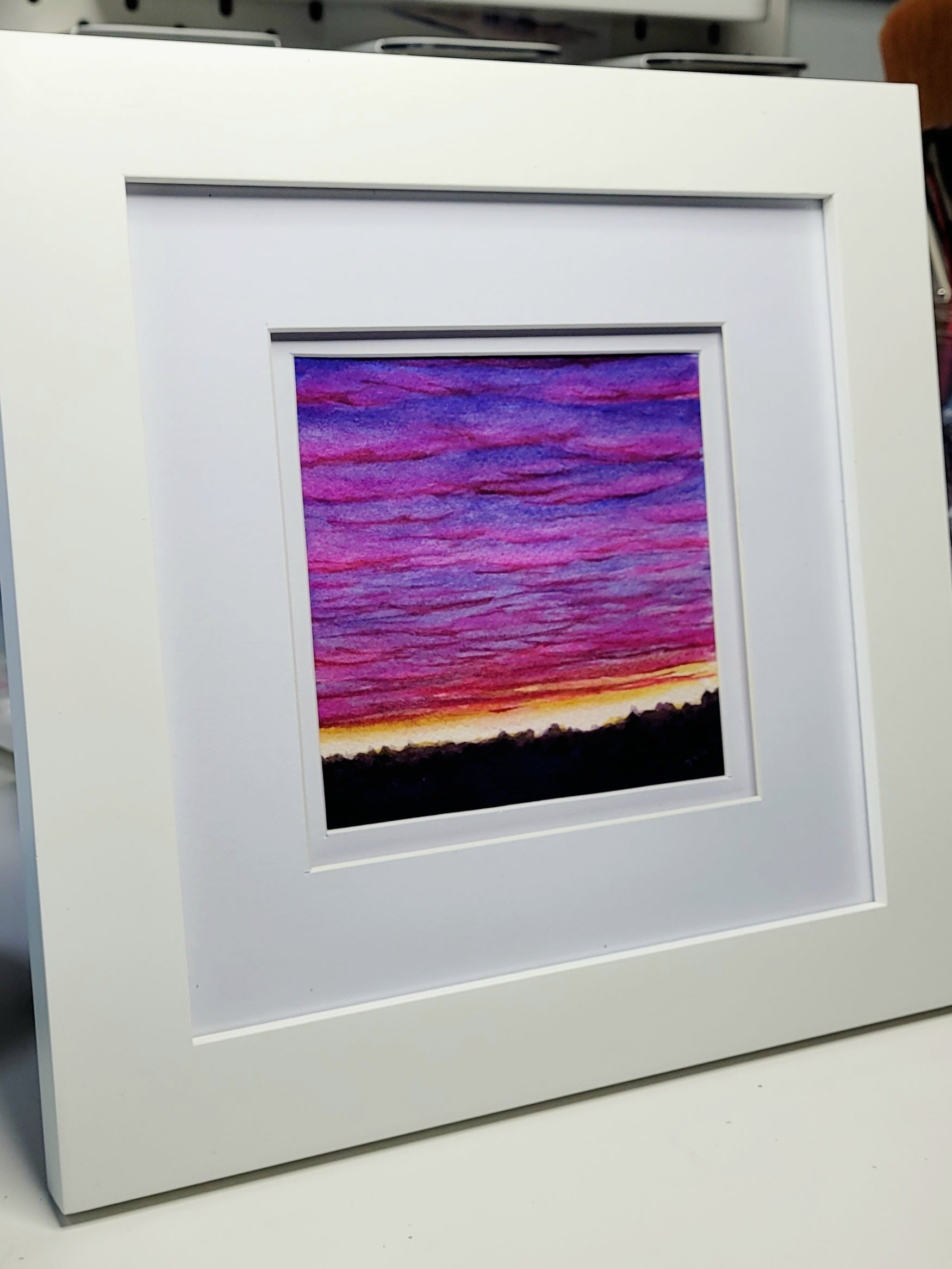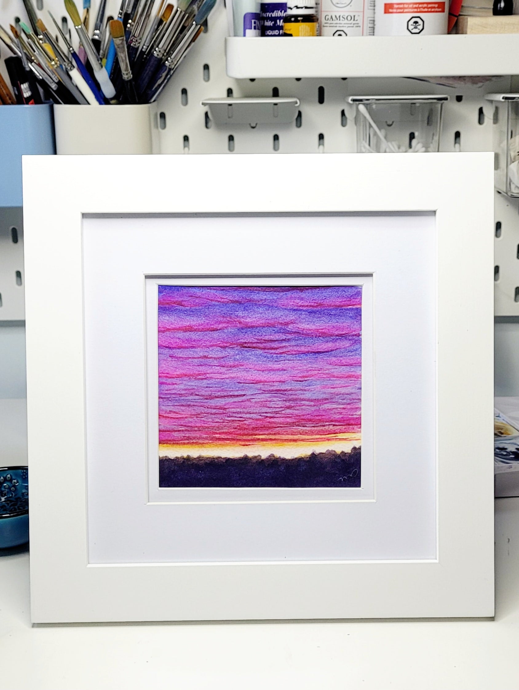 Painted on Arches high end watercolour paper and framed in a double matted, standing or hanging frame. Comes with Certificate of Authenticity.