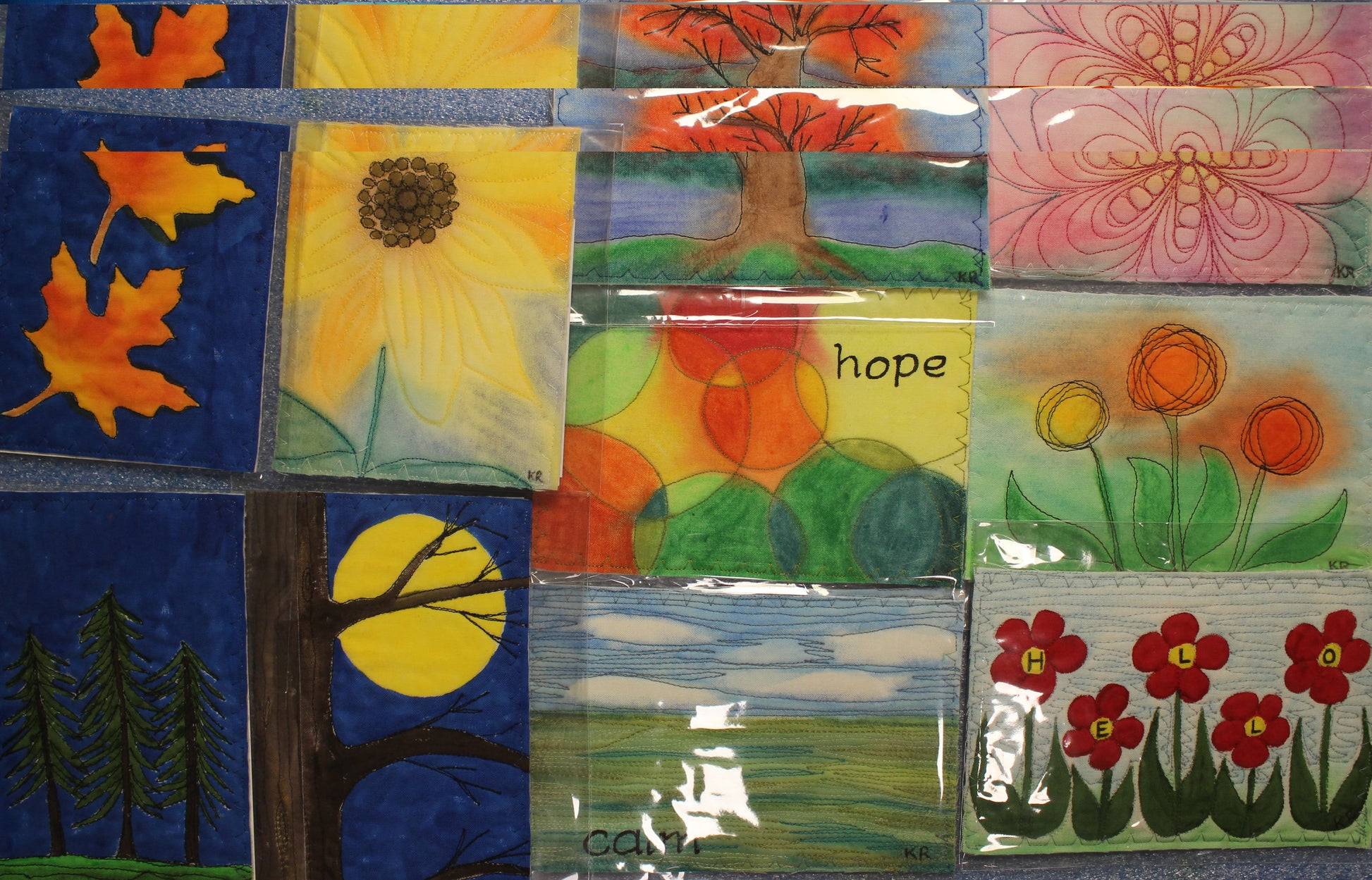 The postcard has one painted, quilted side and a paper template. It measures 4"x6".