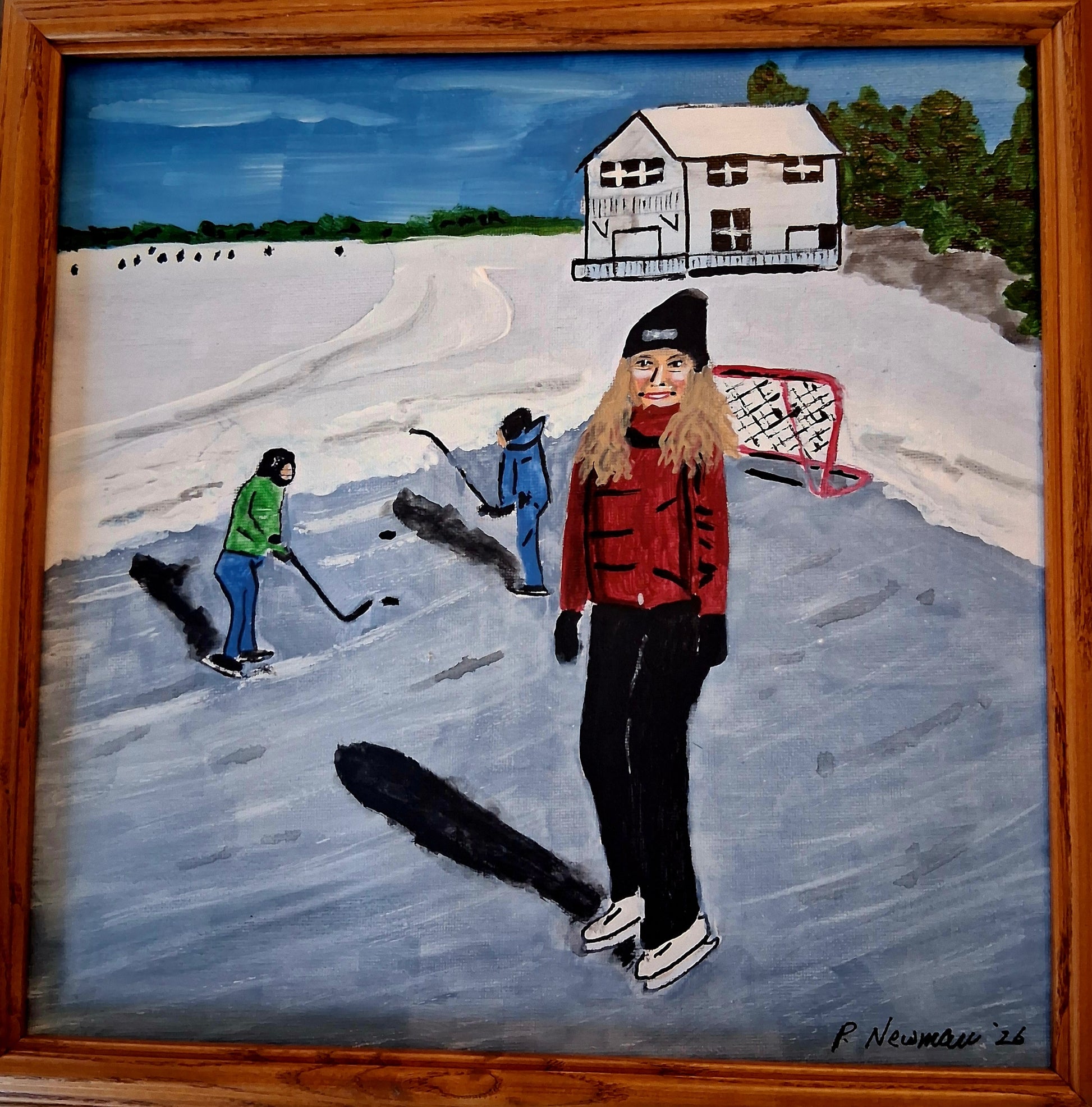 12x12 acrylic painting of a family skating on Brewery Bay in Orillia