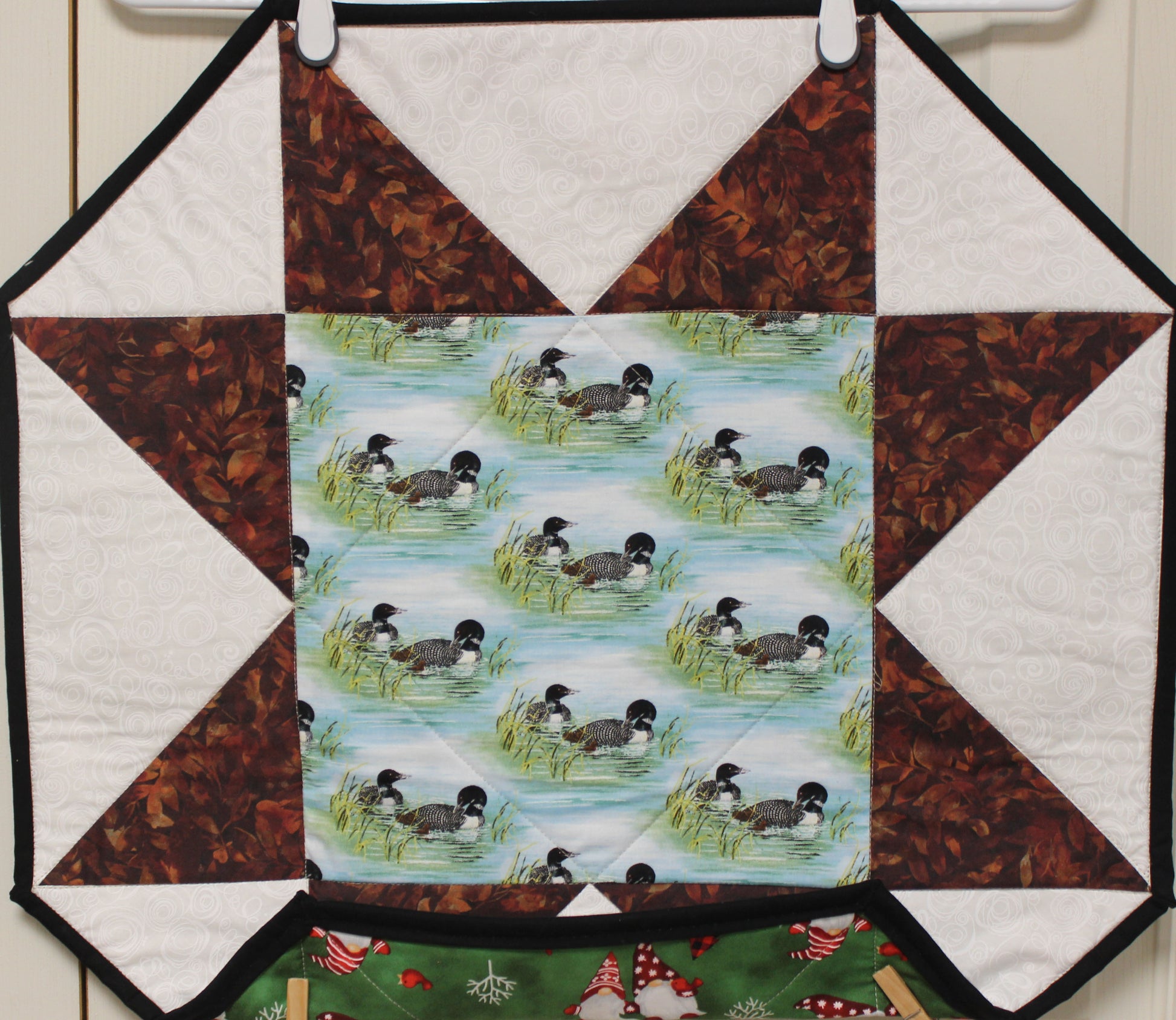 This table runner is great for a small table or centre piece on a round table. There is a special a batting that prevents the heat from a hot casserole to transfer to the surface below. The fabric on the back side reflects a different season.