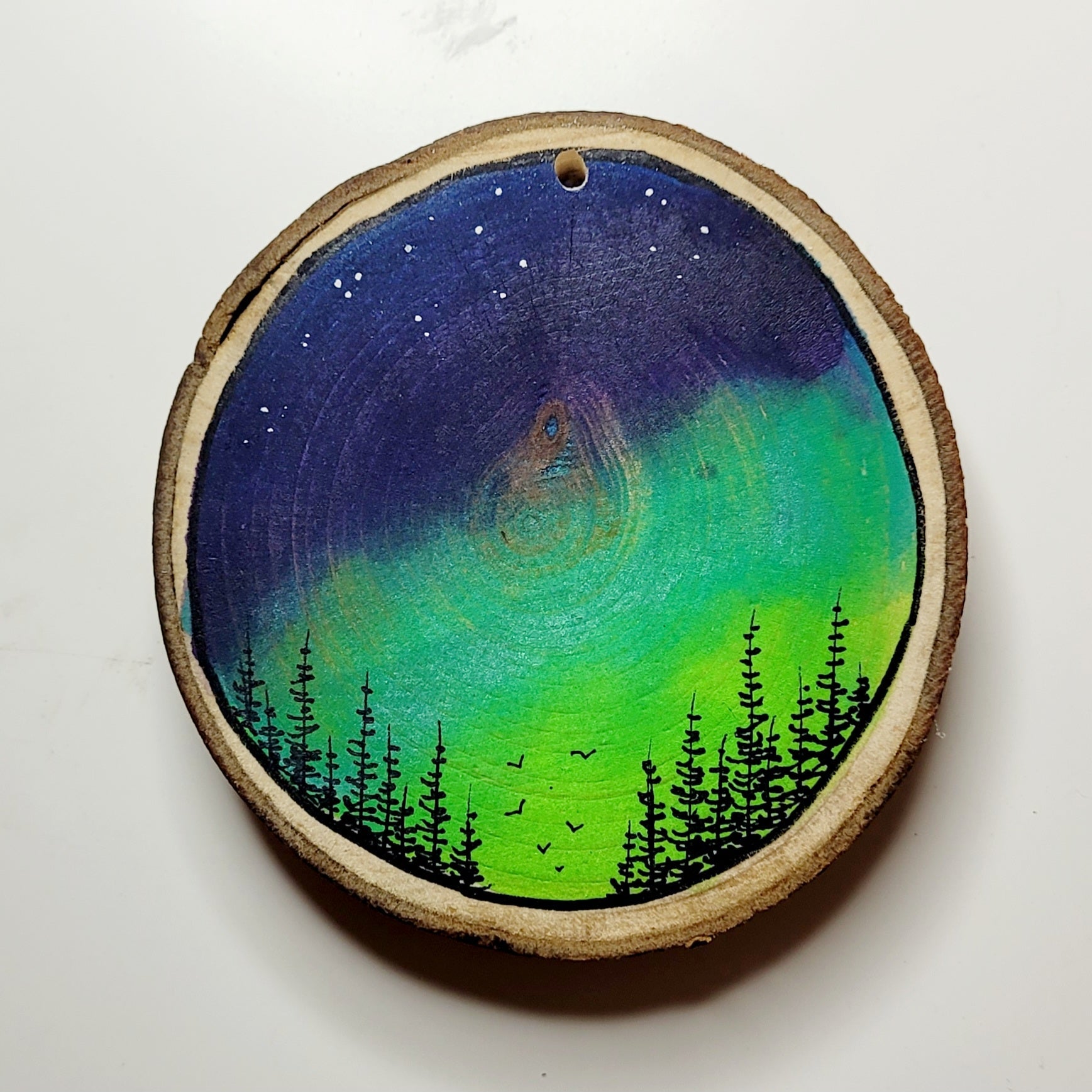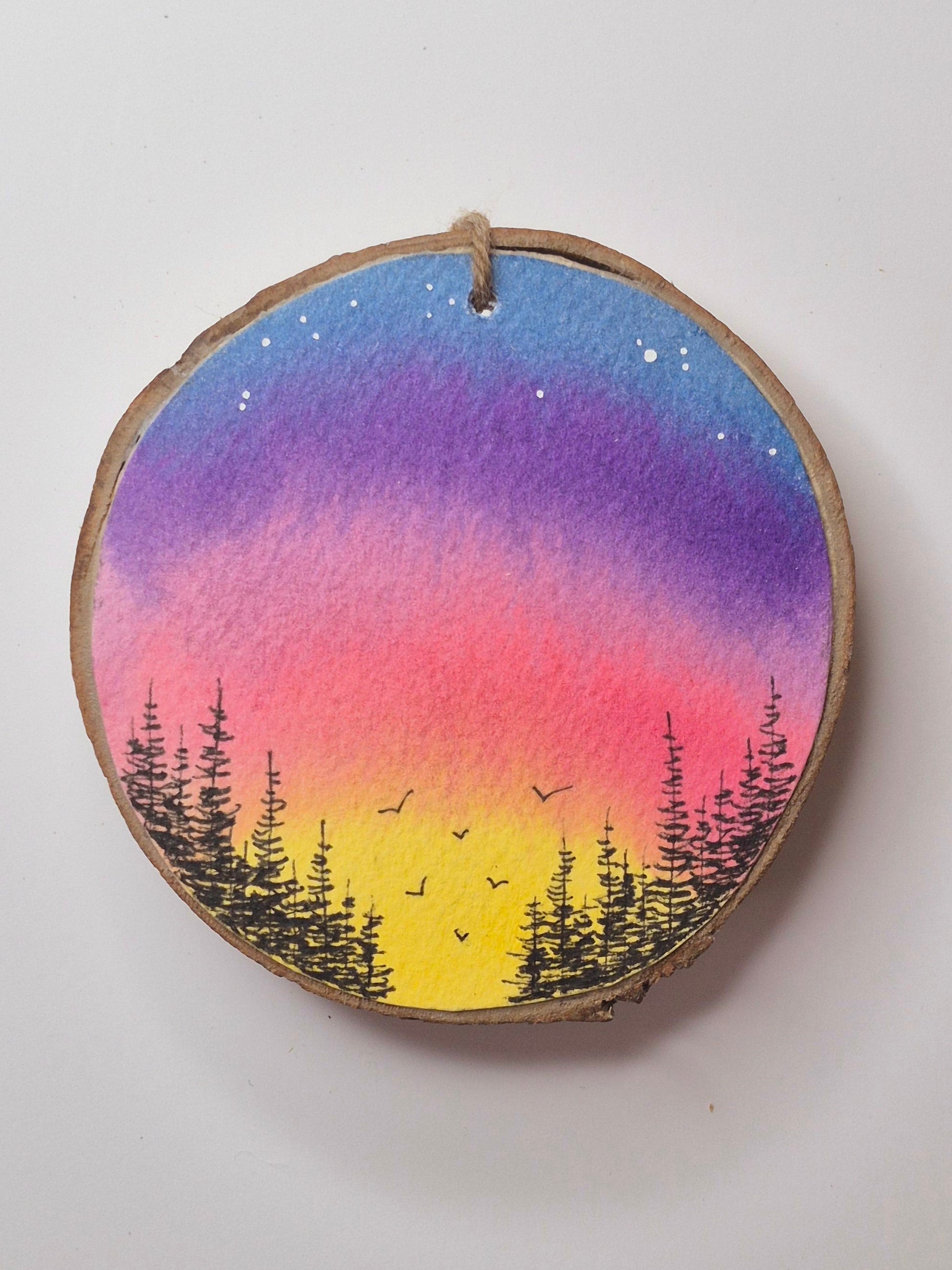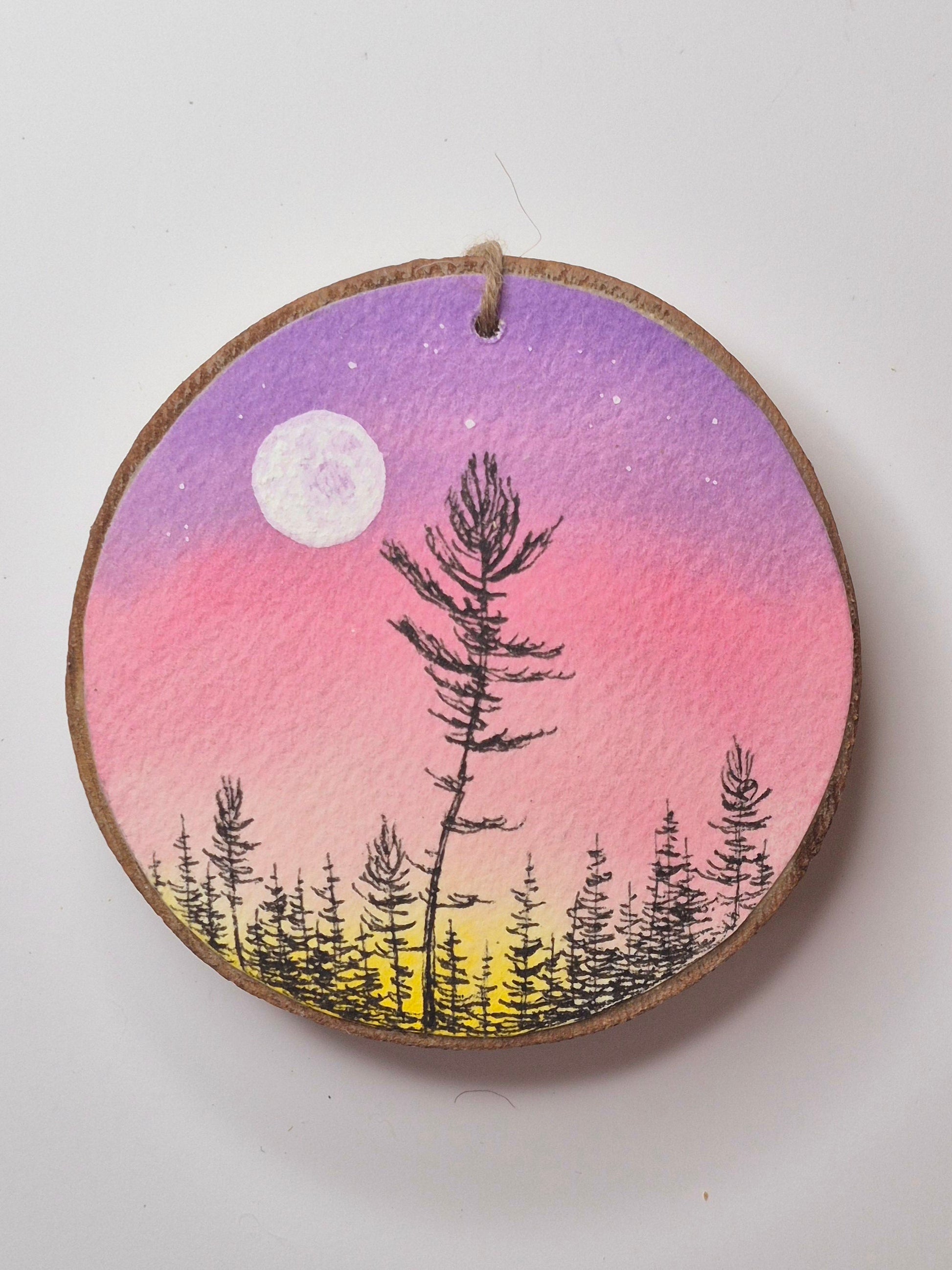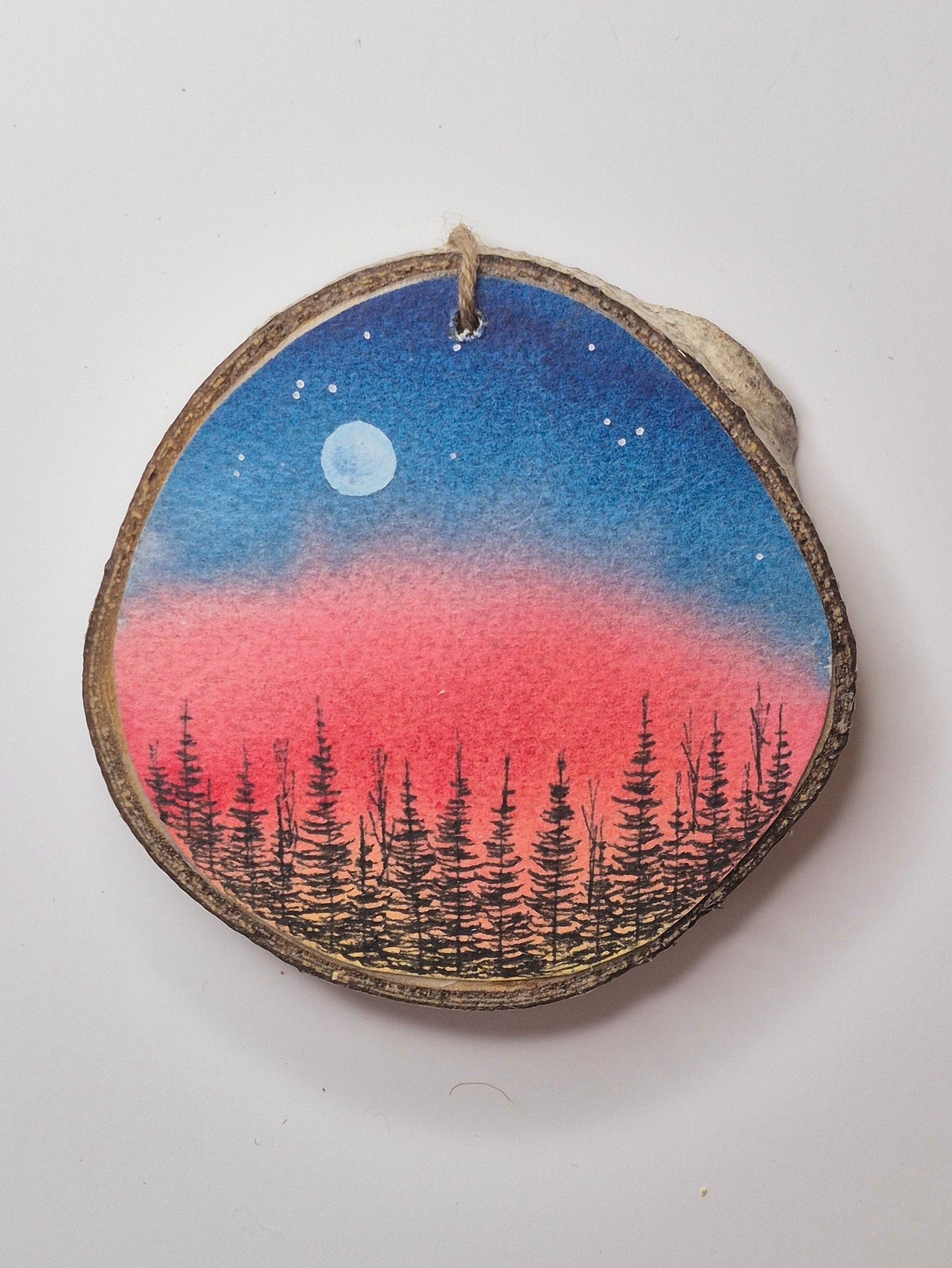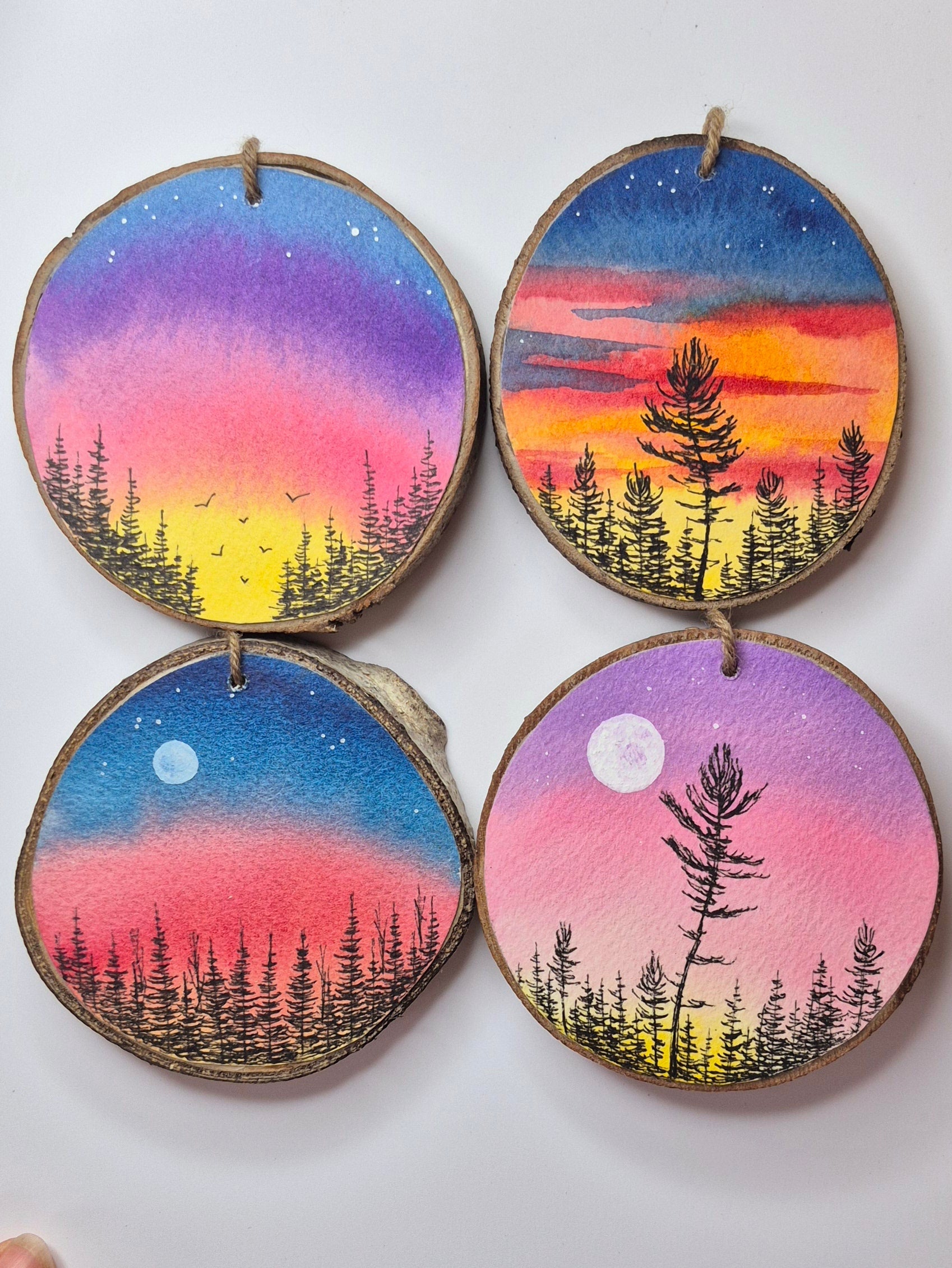 Brighten up your holiday décor with these charmingly hand-painted wood slice ornaments! Create your own unique story in the stars, with an enchanting watercolour sky, moon, sunset and winter designs, sure to light up any winter night. (Or even summer!) Enjoy a beautiful and one-of-a-kind addition to your holiday collection!